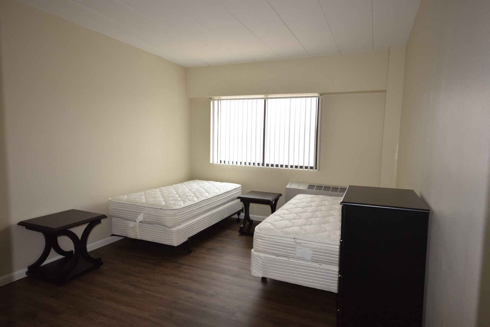 This 2-bedroom, 1-bath unit comes fully furnished and features standard kitchen appliances like a range, refrigerator, dishwasher, garbage disposal, and microwave. Furniture provided includes a small couch and armchair, kitchen table with chairs, a bed for each tenant on the lease, and desks and chairs throughout. The building also features A/C, laundry in the basement, and a trash chute on each floor.